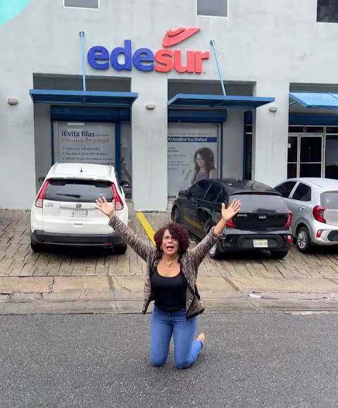 La actriz Cheddy García se arrodilló frente a las oficinas de Edesur este jueves en reclamo por el alto precio de la factura eléctrica.