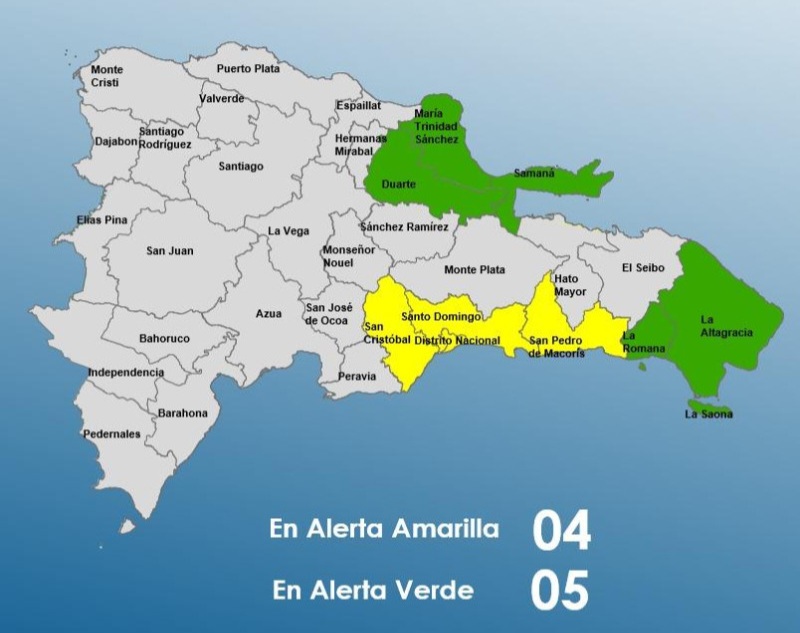 En ese sentido, en alerta amarilla se encuentra San Cristóbal, San Pedro de Macorís, Distrito Nacional y Santo Domingo.