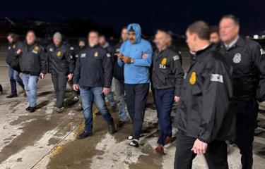 Las imágenes difundidas por medios y agencias oficiales muestran al mandatario venezolano con las manos esposadas, acompañado de su esposa, Cilia Flores, también detenida, mientras es trasladado por agentes federales en un operativo de seguridad reforzada tras su aterrizaje.