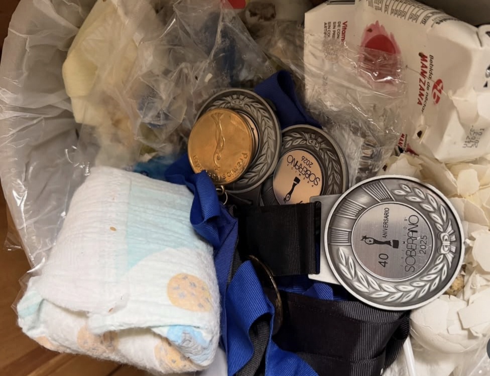 El rapero Vakeró publicó en sus redes sociales una foto de un cubo de basura lleno de las medallas que ha recibido a lo largo de su trayectoria en los Premios Soberano. (CAPTURA PUBLICACIÓN DE INSTAGRAM @VAKERO / DIARIO LIBRE / KEVIN RIVAS)